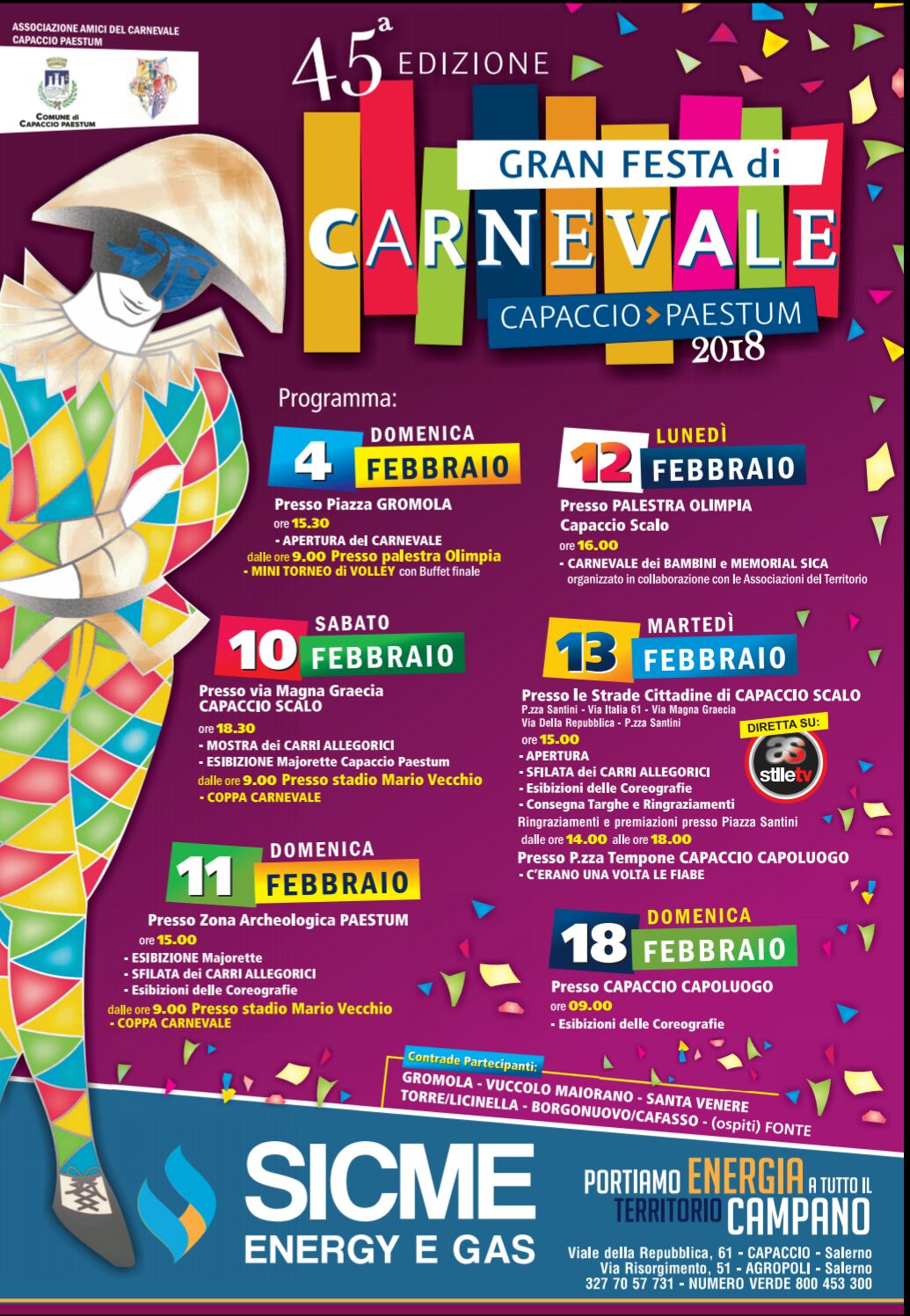 Il ricco programma di eventi si aprirà domenica 4 febbraio, a Gromola, alle 15.30 con la consegna del classico trofeo del Carnevale di Capaccio Paestum dalla contrada vincitrice dell’edizione precedente (Gromola) al Comitato organizzatore, che lo custodirà fino alla serata di premiazione del nuovo carro vincitore. Nel corso del pomeriggio, saranno presentati anche i temi dei carri allegorici dell’edizione 2018. Prenderanno parte alla 45esima edizione del Carnevale le contrade di Gromola, Vuccolo Maiorano, Santa Venere, Torre/Licinella e Borgo Nuovo/Cafasso. Ospite sarà, invece, la contrada di Fonte, del vicino territorio comunale di Roccadaspide.