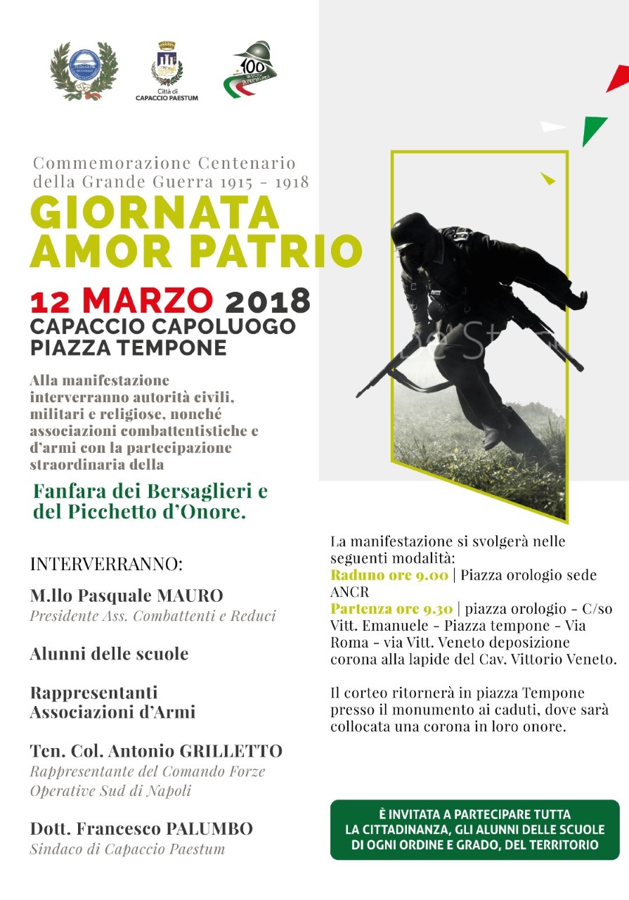 Il Comune di Capaccio Paestum, in occasione delle Commemorazioni del Centenario della Grande Guerra (1914-1918), proclama la “Giornata dell’Amor Patrio”, che si terrà il 12 marzo 2018, a partire dalle 9.30, in piazza Tempone, a Capaccio capoluogo. La giornata celebrativa è stata organizzata in collaborazione con l’Esercito Italiano e con l’Associazione Combattenti e Reduci – Sezione di Capaccio Paestum. Alla manifestazione prenderanno parte Autorità Civili, Militari e Religiose, nonché le Associazioni Combattentistiche e d’Armi. Ci sarà, inoltre, la partecipazione straordinaria della Fanfara dell’8°reggimento Bersaglieri Garibaldi e di un Picchetto d’Onore. La cerimonia sarà presieduta dal Sindaco di Capaccio Paestum, Franco Palumbo, dal Ten. Col. Antonio Grilletto quale rappresentante del Comando Forze Operative Sud di Napoli, dal M.llo Pasquale Mauro presidente dell’Associazione Combattenti e Reduci di Capaccio, dagli alunni delle scuole di Capaccio Paestum e rappresentanti delle Associazioni d’Armi. Le celebrazioni avranno inizio alle 9.00 con il raduno in piazza Orologio e con il successivo corteo Sarà deposta una corona alla lapide ai Caduti della Grande Guerra in via Vittorio Veneto, per poi giungere a Piazza Tempone, dove si svolgerà la cerimonia dell’Alzabandiera con l’Inno Nazionale cantato da tutti ed intonato dalla fanfara dei bersaglieri, diretta dal Maresciallo Marco Di Lucia. Dopo la benedizione del parroco don Vincenzo, sarà data lettura della Preghiera ai Caduti. Per l’occasione sarà allestito un stand informativo dell’Esercito per informazioni circa le opportunità professionali che vengono offerte ai giovani mediante i bandi concorsuali. Sono invitati a partecipare tutti i cittadini e gli alunni delle scuole di ogni ordine e grado del Comune di Capaccio Paestum.