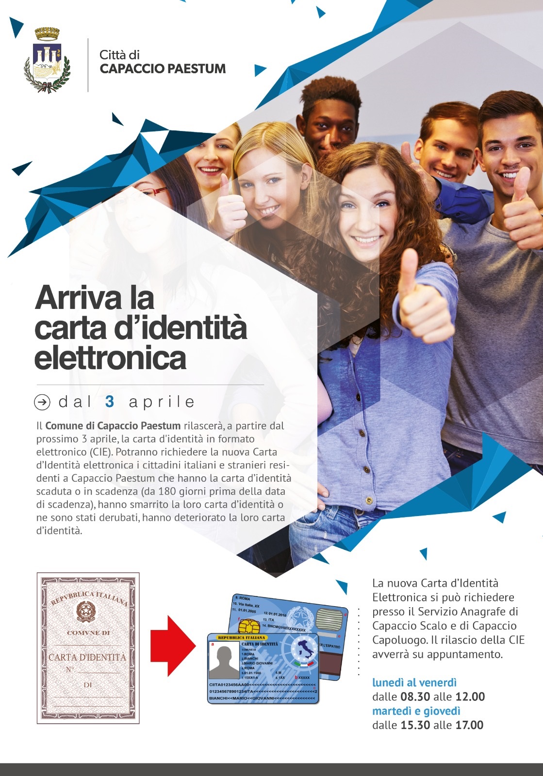 Il Comune di Capaccio Paestum rilascerà, a partire dal prossimo 3 aprile, la carta d'identità in formato elettronico (CIE). Potranno richiedere la nuova Carta d’Identità elettronica i cittadini italiani e stranieri residenti a Capaccio Paestum che hanno la carta d’identità scaduta o in scadenza (da 180 giorni prima della data di scadenza), hanno smarrito la loro carta d’identità o ne sono stati derubati, hanno deteriorato la loro carta d’identità.