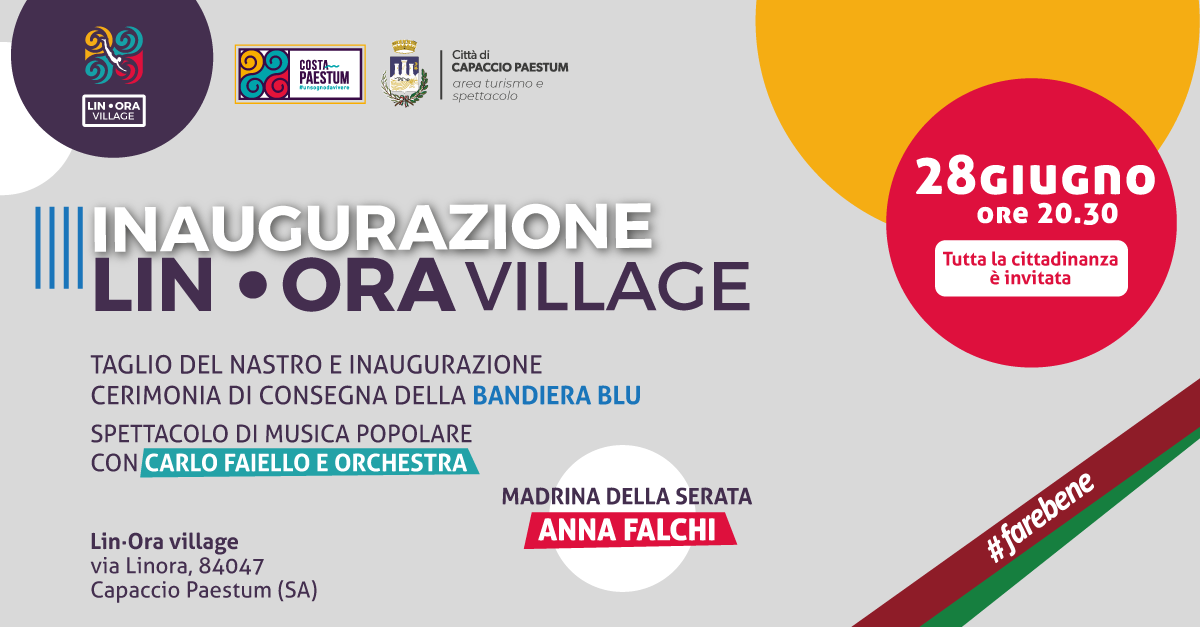 Zainetto in spalla, emozioni in tasca, vita addosso. Comincia il viaggio di Lin●ora Village, l’agorà estiva di di Capaccio Paestum, nata dalle “ceneri” di una vecchia  area degradata e riqualificata dall’Amministrazione comunale in località Linora. Si parte domani sera (28 giugno), alle 20.30, con l’inaugurazione di Lin●ora Village insieme alla madrina dell’evento Anna Falchi e si proseguirà per tutta l’estate tra musica, food, moda, gioco, sport e tanto altro ancora. Nel corso della serata inaugurale, si terrà la cerimonia di consegna della Bandiera Blu agli operatori balneari della Città di Capaccio Paestum. Al termine della consegna della Bandiera Blu, che avverrà alla presenza del presidente FEE Italia Claudio Mazza, si terrà lo spettacolo musicale di Carlo Faiello e della sua orchestra. Tutta la cittadinanza è invitata a partecipare.    L’UFFICIO COMUNICAZIONE