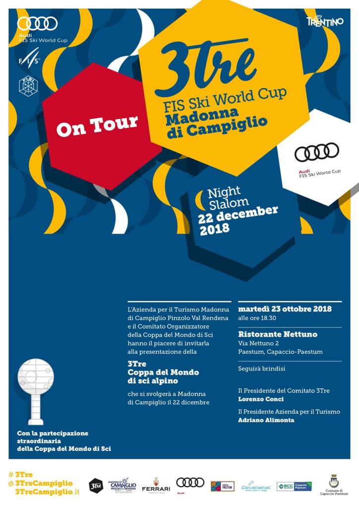 Lo sci incontra la cultura: a Paestum arrivano Madonna di Campiglio e la 3Tre Lo Martedì 23 ottobre il Parco Archeologico di Paestum ospiterà il terzo appuntamento della tournee promozionale dello slalom notturno di Coppa del Mondo FIS, in programma sabato 22 dicembre a Madonna di Campiglio. Quest’anno più che mai, sport e cultura vanno a braccetto nel “3Tre on Tour”, la tournee promozionale dello slalom notturno di Coppa del Mondo FIS in programma sabato 22 dicembre sul Canalone Miramonti di Madonna di Campiglio (prima manche alle 15.45, seconda manche alle 18.45). Dopo Forte dei Marmi e Palermo, la 3Tre e la “sfera di cristallo” (la coppa che spetta al vincitore della Coppa del Mondo FIS) fanno rotta su Paestum (Salerno), dove martedì 23 ottobre alle 18.30 la classica di sci più antica d’Italia sarà ospite del celebre Parco Archeologico, dal 1998 patrimonio mondiale dell’UNESCO. Un incontro con autorità, amici e appassionati in vista della 65a edizione di una gara simbolo dello sci italiano, e un viaggio nella sua storia con un emozionante racconto fra video ed immagini esclusive a cura dello “storico” della 3Tre Paolo Luconi Bisti: questo il cuore della serata di Paestum, che precederà di cinque giorni il tradizionale gigante d’apertura della Coppa del Mondo FIS, in programma domenica 28 ottobre a Soelden (Austria). Già sul ghiacciaio austriaco del Rettenbach è previsto il primo incrocio tra i grandi duellanti nelle discipline tecniche, l’austriaco Marcel Hirscher (vincitore alla 3Tre nel 2012 e nel 2017) e il norvegese Henrik Kristoffersen (primo a Madonna di Campiglio nel 2015 e nel 2016), che negli ultimi anni hanno dominato le pendenze del Canalone Miramonti. Le due superstar dei pali snodati hanno infatti messo nel mirino il secondo posto tra i plurivincitori dello slalom del Canalone Miramonti, occupato da Alberto Tomba con tre affermazioni, alle spalle dell’inarrivabile Ingemar Stenmark, a quota cinque successi. Madonna di Campiglio e Paestum, montagna e mare, nord e sud. Sarà un incontro ricco di fascino fra due località straordinarie, un abbraccio ideale fra eccellenze patrimonio mondiale dell’UNESCO come il Parco Archeologico di Paestum e le Dolomiti di Brenta, nel cui cuore sorge Madonna di Campiglio, e altrettanti geoparchi UNESCO, il Cilento Vallo Diano Global Geopark e l’Adamello Brenta Global Geopark. “Quello fra 3Tre e Paestum è sicuramente un incontro insolito, ma proprio per questo così entusiasmante - ha spiegato Loredana Bonazza, responsabile area comunicazione del Comitato 3Tre e promotrice del 3Tre on Tour. “L'obiettivo del 3Tre on Tour è avvicinarsi e incontrare gli appassionati dello sci, spingendoci anche lontano dai contesti più tradizionali per il Circo Bianco, e a Paestum incontreremo tante persone che amano la neve e il turismo invernale nella ski area Campiglio-Dolomiti di Brenta. Ci teniamo inoltre a ringraziare l’azienda Convergenze S.p.A., operatore delle telecomunicazioni leader nel sud d’Italia, che ha contribuito a portare l’universo 3Tre in una delle perle della Magna Grecia”.