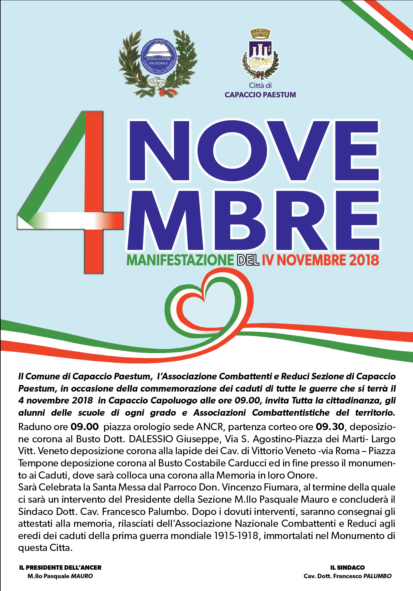 Il corteo partirà dalla Sezione Combattenti e Reduci in piazza Orologio alle ore 9.30 proseguendo, dopo aver deposto una corona al Monumento alla memoria del dottor Giuseppe D’Alessio, fino a Piazza Tempone, dove sarà deposta una corona al busto di Costabile Carducci ed, infine, una al Monumento ai Caduti da parte di Amministrazione comunale e Associazione Combattenti e Reduci sezione di Capaccio Paestum.
