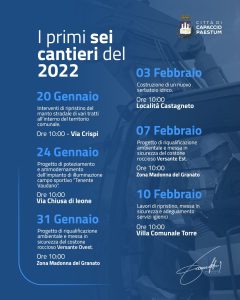 «Quelli che andiamo ad avviare nei prossimi venti giorni sono solo i primi sei cantieri di un anno che si preannuncia molto proficuo per Capaccio Paestum – afferma il sindaco Franco Alfieri – Si tratta di lavori tutt’altro che di secondo ordine: il rifacimento di varie strade del Comune, la mesa in sicurezza dei costoni rocciosi del monte sovrastante la Madonna del Granato, il potenziamento della pubblica illuminazione dello stadio del Capoluogo, la riqualificazione della villa comunale a Torre e la realizzazione di un nuovo serbatoio che risolverà definitivamente i problemi di approvvigionamento idrico di tanti cittadini. Tutto questo vuol dire impegno, attenzione, interesse e cura per ogni parte del territorio, per la Comunità e le sue esigenze. È il segno tangibile che siamo e saremo incessantemente al lavoro per la Città».