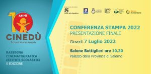 Il 7 luglio 2022, in conferenza stampa sarà ufficializzato il programma della finalissima, che si svilupperà in due giornate, il 12 e il 13 luglio presso l’Area Archeologica dei Templi di Paestum, tra sorprese e guest star, per la consegna dei CINEDÙ SCHOOL MOVIE AWARD, i premi assegnati dalla giuria per i migliori cortometraggi realizzati dai bambini della Scuola Primaria e dai ragazzi della Secondaria di I Grado. School Movie – Cinedù è anche sostenibilità, con il premio speciale dedicato allo spot contro lo spreco alimentare.